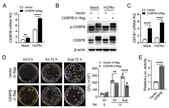 CEBPB promotes DEFB1 expression to exert anti-tuberculosis effects in AEC-II cells. (A–D) A549 cells were overexpressed with CEBPB using lentivirus infection, and qPCR and Western blot analysis of CEBPB (A,B) and DEFB1 (C) expression in A549 cells with CEBPB overexpression and H37Rv infection at MOI = 10 for 72 h. (D) CFU assay of the bacterial amounts in and out of A549 cells with CEBPB overexpression and H37Rv infection at MOI = 10 for 72 h. (E) Luciferase reporter assays of transcriptional regulation of the DEFB1 promoter by CEBPB. Data are presented as mean ± SD and are representative of at least three experiments with similar observations. Simple t-tests and ANOVA were used for comparisons involving two and three or more variables, respectively. ** p < 0.01; **** p < 0.0001.