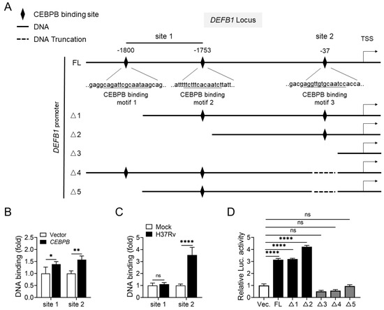 Identification of CEBPB binding sites in the DEFB1 promoter. (A) Schematic diagram of recombinant plasmids carrying full-length or various truncated forms of the DEFB1 promoter. (B) ChIP assays of CEBPB binding to the different regions of the DEFB1 promoter in A549 cells overexpressing CEBPB. (C) ChIP assay of CEBPB binding to the different regions of the DEFB1 promoter in A549 cells infected with H37Rv at MOI = 10 for 72 h. (D) Luciferase reporter assays of transcriptional regulation of full-length or truncated forms of the DEFB1 promoter by CEBPB in 293T cells transfected with various DEFB1 promoter expression plasmids. Data are presented as mean ± SD and are representative of at least three experiments with similar observations. ANOVA was used for comparison involving three or more variables. * p < 0.05; ** p < 0.01; **** p < 0.0001, ns; non-significant.