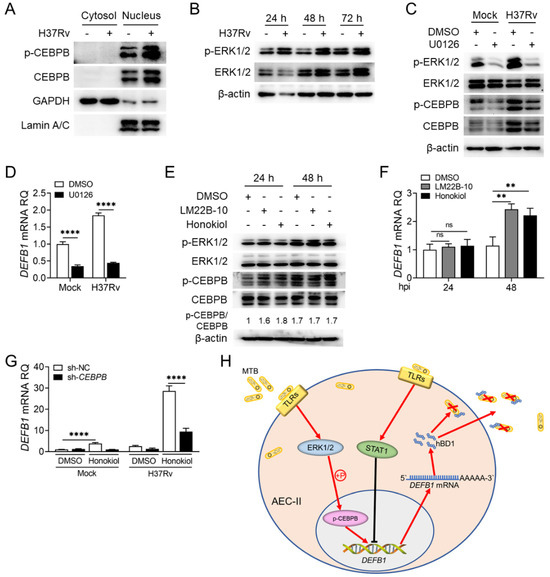 Activation of theERK1/2 pathway after Mtb infection promotes CEBPB phosphorylation and DEFB1 expression in AEC-II cells. (A) Nuclear–cytoplasmic fractionation assay of the distribution of CEBPB in the nucleus and cytoplasm after infecting A549 cells with H37Rv at MOI = 10 for 72 h. (B) Western blot assay of activation of the ERK1/2 pathway in A549 cells infected with H37Rv at MOI = 10 for 72 h. (C,D) Western blot analysis of ERK1/2 and CEBPB phosphorylation (C), and qPCR analysis of DEFB1 expression (D), in A549 cells pretreated with U0126 for 1 h and then infected with H37Rv at MOI = 10 for 72 h. (E,F) Western blot analysis of ERK1/2 and CEBPB phosphorylation (E), and qPCR analysis of DEFB1 expression (F), in A549 cells pretreated with LM22B-10 or Honokiol for 1 h and infected with H37Rv at MOI = 10 for 48 h. (G) qPCR analysis of DEFB1 expression in CEBPB-silenced A549 cells treated with Honokiol and infected with H37Rv at MOI = 10 for 48 h. (H) Schematic diagram of the molecular mechanism of the ERK1/2-CEBPB axis but not STAT1 in the regulation of hBD1 expression in AEC-II cells against Mtb infection. Data are presented as mean ± SD and are representative of at least three experiments with similar observations. ANOVA was used for comparison involving three or more variables. ** p < 0.01; **** p < 0.0001, ns; non-significant.
