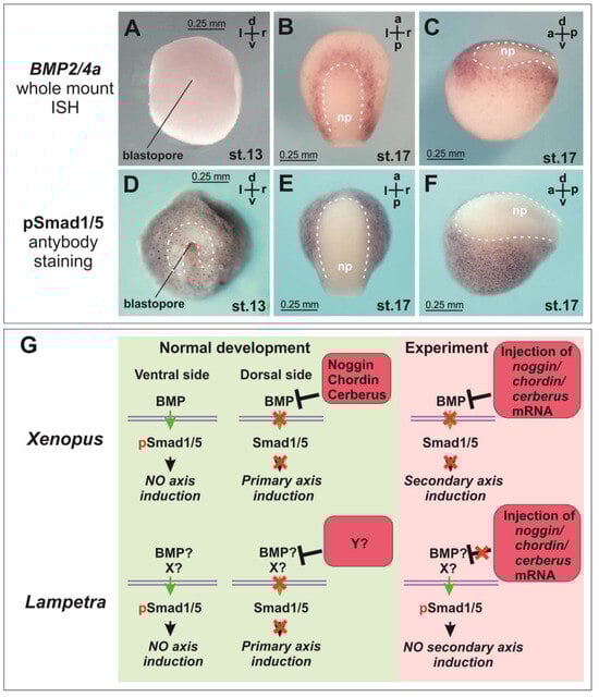 Figure 2E,F). However, our data suggest that both the mechanism of activation of Smad1/5 phosphorylation at the gastrula stage and the mechanism of its subsequent suppression in the neural plate region at the neurula stage in lamprey may differ from the mechanism described in amphibians. For instance, this mechanism may be associated not only with the activity of BMP but also with other factors (