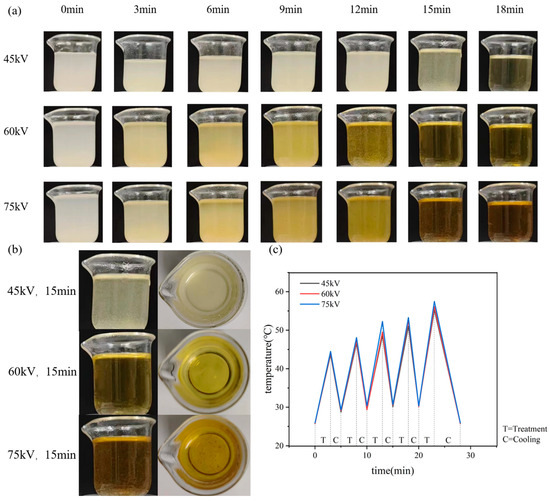 Figure 2 shows the chitosan suspension and its temperature change during plasma treatment with different voltages and time. Figure 2a shows the chitosan suspension without plasma treatment, indicating that chitosan is usually insoluble in water and uniformly dispersed in water, forming a suspension. At the same discharge voltage, for example, at 45 kV, chitosan gradually dissolves as the treatment time increases. However, there is a small amount of undissolved chitosan when the treatment time is 15 min. All chitosan was dissolved when the treatment time reaches 18 min. When the discharge voltage was 60 kV, chitosan was completely dissolved by the treatment of 15 min. When the discharge voltage was 75 kV, some chitosan was charred and black flocculent appeared in the solution at 12 min. Figure 2b shows the side view and top view of chitosan dissolved at different discharge voltages, which indicates that chitosan was dissolved best at the treatment of 60 kV and 15 min.