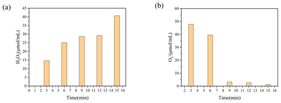During the treatment of the chitosan solution in plasma, the charge and active components in the plasma interact with water to produce plasma-activated water with active substances such as ·OH, H2O2, and O 2 [33]. On the one hand, chitosan can be dissolved in the acidic condition formed by the plasma-activated water. On the other hand, these active substances can oxidize and degrade part of the chitosan under the acidic conditions of the plasma-activated water, improving the dissolution effect of chitosan [34]. In the absence of chitosan, OH radicals generated by plasma burst to form a variety of substances, including H2O2. The reaction ·OH + ·OH → H2O2 has been shown to be the main chemical pathway for the formation of hydrogen peroxide in plasma-treated solutions [32]. Therefore, the rate of OH radical production can be qualitatively and indirectly shown by measuring the H2O2 concentration of the treated chitosan solution.