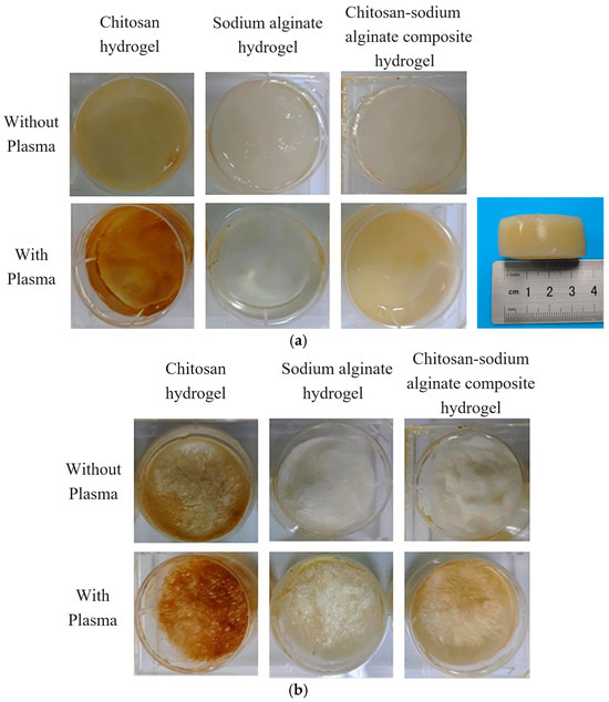 Figure 5. Comparison of three hydrogels with and without plasma treatment and their effects after freeze-drying. (a) Comparison of three kinds of hydrogels with and without plasma treatment (the subfigure with the ruler shows the sideview of chitosan-sodium alginate composite hydrogel with plasma). (b) Comparison of hydrogels with and without plasma treatment after freeze-drying.