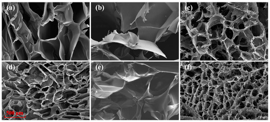 Figure 6. Surface morphology of the hydrogels. (ac) are chitosan hydrogel, sodium alginate hydrogel and chitosan-sodium alginate composite hydrogel, and (df) are chitosan (DBD) hydrogel, sodium alginate (DBD) hydrogel, and chitosan (DBD)-sodium alginate composite hydrogel.