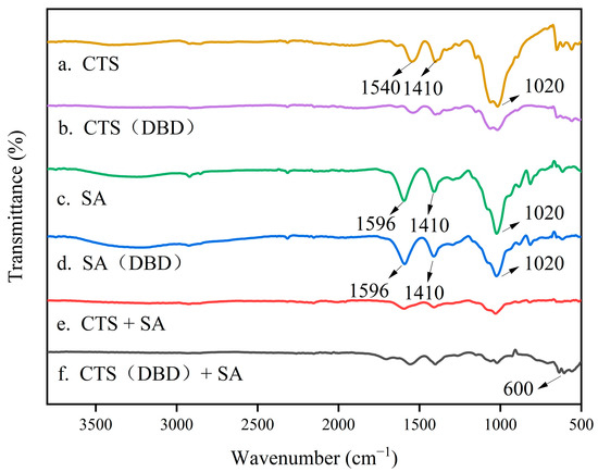 The composition of a hydrogel and the bonding of its internal groups can be detected by Fourier Transform Infrared Spectroscopy (FTIR). When a beam of infrared light with a continuous wavelength passes through a substance, a group in the substance molecule vibrates or rotates at the same frequency as the infrared light, the molecule absorbs energy and jumps from the original ground state energy level to a higher energy level. When cross-linking occurs in hydrogel, the molecular chains are bonded or interact with each other. When infrared light passes through the hydrogel, the light at the corresponding wavelength is absorbed by the chemical bond, while the light at other wavelengths has no effect. This makes it possible to detect changes in the composition of the hydrogel and the bonding of the internal groups. As shown in Figure 7, the infrared spectrum of freeze-dried hydrogel powders after compaction are compared. It can be seen that in the FTIR spectrum of chitosan, the absorption peaks at 1540 cm−1 and 1410 cm−1 are from the amide bands [45] and 1020 cm−1 are from ammonium ions. After being plasma treated, the peaks of amide bands nearly disappear and the peak of ammonium ions significantly weakens. In the spectrum of sodium alginate gels, the peaks at 1596 cm−1 are the characteristic absorption peaks of sodium alginate [46], and in this spectrum the peak of 1020 cm−1 is slightly weakened after plasma treatment. Through comparing the spectrum a, c and e, it can be seen the significantly weakened peaks at 1596, 1540, 1410, and 1020 cm−1 indicate the interaction of ammonium ions on the molecular chain of chitosan and the carboxylate ions on the molecular chain of sodium alginate. In addition, from the comparison of the spectrum e and f, when applying plasma treatment, there is a broad absorption peak at about 600 cm−1, which corresponds to the product after the cross-linking reaction of chitosan and sodium alginate.