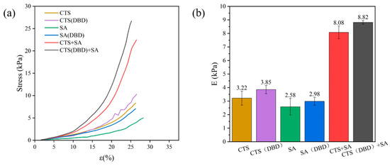 Figure 8. Stress–strain curves and compression modulus of different types of hydrogels, which are chitosan hydrogel, sodium alginate hydrogel, chitosan-sodium alginate composite hydrogel without and with plasma treatment. (a) Stress–strain curves for different types of hydrogels; (b) compression modulus of different types of hydrogels.