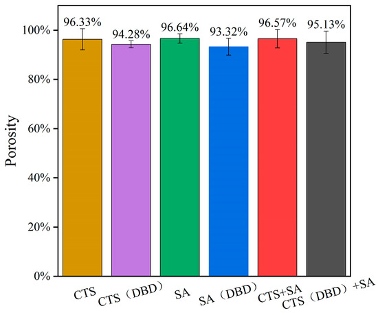 Porosity is the percentage of pores in a hydrogel in relation to its total volume. The porosity of a hydrogel can visually indicate the water absorption and retention properties of the hydrogel. The porosity and size of pores also affect the strength and stability of hydrogels. The porosities of these hydrogels are shown in Figure 9, where it can be seen that the porosities of these hydrogels are between 93% and 97%. It can be seen that the porosity of plasma-assisted hydrogels is slightly lower than those without applying plasma. This is because plasma treatment increases the degree of cross-linking of the hydrogels, and accordingly decreases the porosity. The increased porosity of chitosan will help the hydrogel to absorb more water (conducive to cell growth). However, too high porosity will reduce the mechanical strength of hydrogels. At present, mechanical strength is the main problem of chitosan-based hydrogels encountered in application. So, the appropriate reduction of the porosity is favorable for the improvement of the mechanical strength. The results of this experiment show that the plasma-assisted preparation of hydrogels can properly reduce porosity and improve the performance in mechanical strength (as shown in Section 2.6).