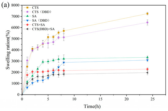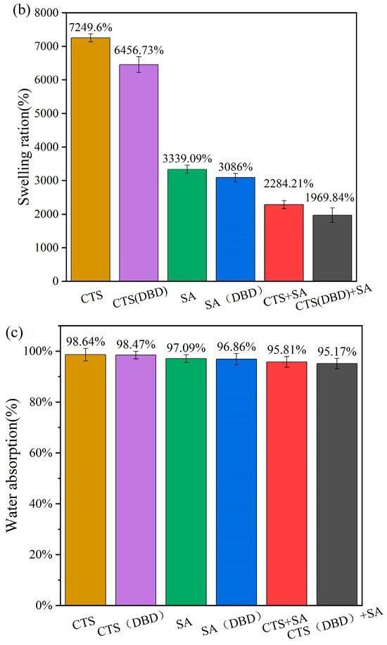 Water absorption and the swelling ratio are the two key parameters that indicate the properties of hydrogels. The water absorption ratio means the mass of absorbed water divided by the total mass of hydrogel after absorbing water. The swelling ratio means the mass of the absorbed water divided by the original mass of freeze-dried hydrogel. The high swelling ratio of hydrogels is attributed to their porous and the abundance of hydrophilic groups in the polymer chains. Swelling process, i.e., swelling ratio versus time, are carried out on these hydrogels, which is shown in Figure 10. It can be seen that without applying plasma, the swelling process reaches equilibrium after 8 h for sodium alginate hydrogel and chitosan-sodium alginate composite hydrogel, while the swelling process of the chitosan hydrogel is still continuing to increase with time. Comparing the swelling process of hydrogels with and without applying plasma, the swelling trends with time is similar, but the swelling process curves of the plasma-assisted hydrogels are lower than those of without plasma assistance. This can be understood as follows. During the swelling process, water penetrates into the hydrogel to swell its volume, the three-dimensional network of the hydrogel extends to perform volume expansion in three-dimensions, and at the same time, the molecular network generates elastic forces that shrink the network. The swelling equilibrium position is reached when the two forces reach equilibrium. At this time, the swelling ratio of the hydrogel is related to the type of the hydrogel and the cross-linking density [48]. The higher the crosslink density, the lower the swelling ratio. From the swelling equilibrium point, it can be seen that the decrease of the swelling ratio of plasma-assisted hydrogel is due to the increase of the cross-linking density, which can be shown in Figure 10a. Figure 10c shows the water absorption of different hydrogels, from which it can be seen that the water absorptions of plasma-assisted hydrogels are very slightly reduced compared to those without plasma. The water absorption of a hydrogel is related to its porosity and the characteristics of its pores. This is because water is drawn in through the open pores of the hydrogels and penetrates into the interior through the connecting pores. The more and larger pores that are connected to the outside, the more water the pores absorb. From the perspective of application, when the water retention of a hydrogel reaches more than 80%, it can meet the requirements of application. On the contrary, too much water absorbed easily causes the reduction of mechanical strength of chitosan hydrogels and can make them easy to rupture, which is another main problem of chitosan hydrogels in the application of the current. Therefore, the appropriate reduction of water absorption is conducive to improving the mechanical strength. Combined with the SEM images in Figure 6, it can be found that the pore sizes of the hydrogels with plasma preparation are significantly reduced, indicating that plasma treatment can improve the crosslinking degree and reduce the pore sizes by modifying the groups on the molecular chain to appropriately reduce the water absorption ratio.