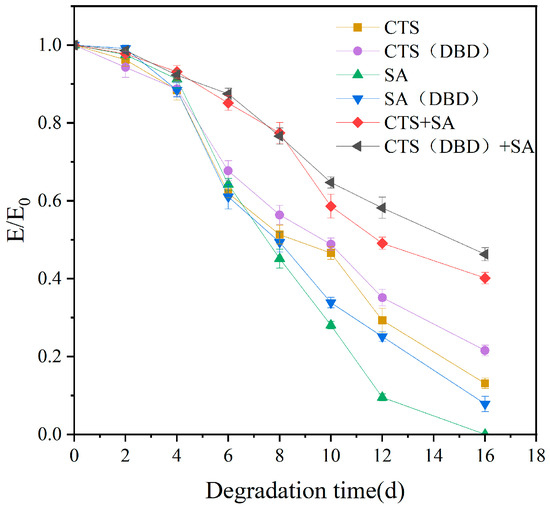 Degradation ability is very important for the use of hydrogels in biomedical or tissue engineering fields. Shorter degradation time requires multiple replenishments or replacements, longer degradation time can affect the normal physiological functioning of the cell or organism, and appropriate degradation time can help to minimize any abnormal reactions that may exist. Degradation can be simulated using in vitro simulation, and the degradation degree can be characterized by the change of the compression modulus of hydrogels. Figure 11 shows the change of compression modulus of the hydrogels over time, in which E/E0 is the ratio of the compression modulus at that time to the initial compression modulus. As we can see, E/E0 gradually decreases with time, indicating that degradation is occurring. The degradation curve with time shows that E/E0 of plasma-assisted hydrogels is generally higher than those without plasma, i.e., the degradation ratio of plasma-assisted hydrogels is lower than those of without plasma, or the stability is higher than those of without plasma. In addition, E/E0 of the chitosan-sodium alginate composite hydrogel is significantly higher than that of single component hydrogels. Taking the composite hydrogel as an example, the initial compression modulus of hydrogel without plasma is 8.08 kPa and drops to about 3.24 kPa on the 16th day of degradation, which indicates that the hydrogel still retained about 40% of its original mechanical strength after 16 days of degradation. The initial compression modulus of the plasma-assisted composite hydrogel is 8.82 kPa and drops to 4.08 kPa on the 16th day, i.e., 46.28% of the compression modulus is retained, which indicates that the degradation ratio of the plasma-assisted composite hydrogel is reduced. That is, plasma-prepared hydrogel can enhance the anti-degradation ability.