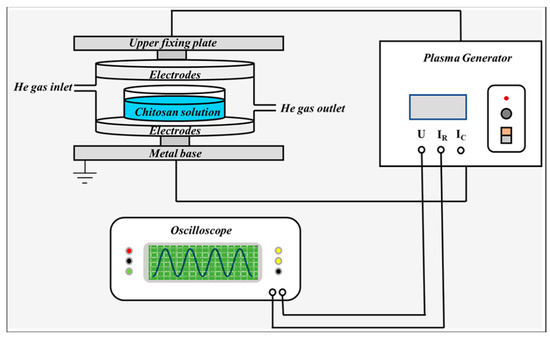 This experiment used a DBD device, schematically shown in Figure 12. The experimental device consists of two round aluminum plate electrodes. The lower electrode is grounded. During the treatment, a high borosilicate container covered with a quartz cover plate containing chitosan suspension, sodium alginate solution or their combination was placed between the upper and lower electrodes to be treated. Helium gas with a rate of 5 L/min was filled into the container at atmospheric pressure. The discharge current and voltage waveforms were measured by a Tektronix oscilloscope (Tektronix TBS1102B, Tektronix, Johnstown, PA, USA) and a voltage probe (Tektronix TPP0101, Tektronix, Johnstown, PA, USA). Then, the discharge power was calculated.