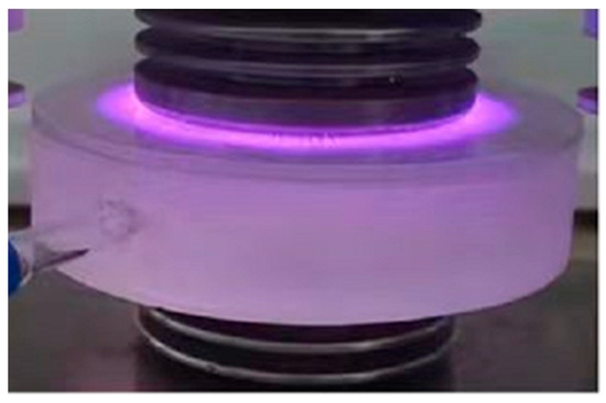 Figure 13 shows the discharge waveforms of discharge voltage and current at 60 kV acquired by a digital oscilloscope. It can be seen that the discharge voltage waveform applied to the electrodes is sinusoidal. The discharge state is between uniform discharge and filamentary AC discharge with one or more discharges in half a voltage cycle. The discharge power is calculated to be 150 W from the Lissajous plot of voltage-current curves. Figure 14 shows the image of discharge when helium was filled into the discharge chamber at atmospheric pressure, showing the purple dominant discharge colors.