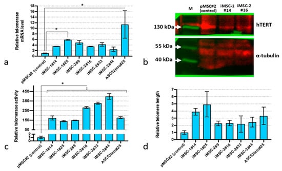 Telomerase expression in immortalized MSCs. (a) TERT mRNA expression level before (pMSCs) and after the immortalization procedure (iMSC-1 and iMSC-2) established using qPCR; (b) Western blot analysis of TERT protein content; (c) telomerase activity assessment by qPCR assay; (d) relative telomere length. *—p < 0.05 (ANOVA multiple pairwise comparison, Tukey test), n = 3. Data are presented as mean ± standard deviation.