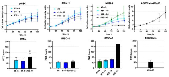iMSC proliferation. Proliferation of pMSC and iMSC cultures was assessed via measuring the dynamics of cell density (upper panels) and calculating the population doubling time (PDT, lower panels). #N—passage number, *—p < 0.05—pMSCs PDT vs. iMSCs PDT at the corresponding passage, n ≥ 4. Data are presented as mean ± standard deviation.