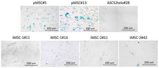 iMSCs senescence. Beta-galactosidase activity (blue color) was analyzed in pMSCs and ASC52telo cell line (upper panel’s row) as well as iMSCs-1 and iMSCs-2 cell lines. Passage number is indicated for each cell line.