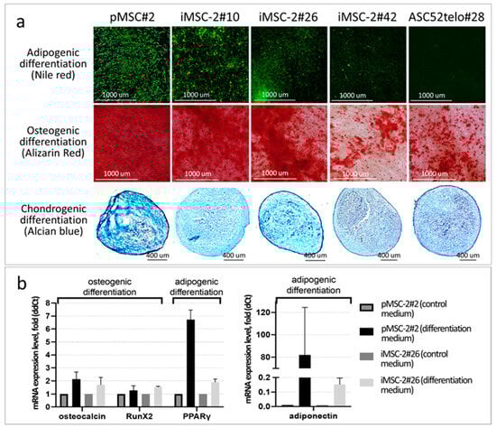 To assess the differentiation potential, iMSCs, pMSCs and ASC52telo were differentiated toward osteogenic, chondrogenic and adipogenic lineages in vitro, and their ability to express specific lineage mRNA markers (PPARγ and adiponectin for adipogenic differentiation, osteocalcin and RunX2 for osteogenic differentiation) was assessed.