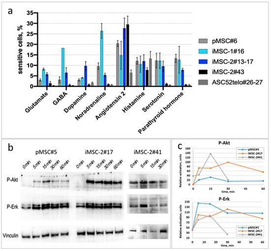 iMSC response to hormones. (a) The portion of cells, responded to glutamate (10−5 M), GABA (2 × 10−5 M), dopamine (10−5 M), noradrenaline (10−6 M), angiotensin II (10−8 M), histamine (10−6 M), 5-HT (10−5 M) and PTH (10−8 M) by increase in cytoplasmic Ca2+ influx. (b,c) AKT and ERK phosphorylation in response to insulin. Western blot of MSC samples with P-AKT and P-ERK specific antibodies. (c) Vinculin content was used as a reference for densitometry of P-AKT and P-ERK bands.