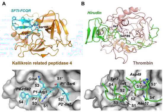 The cyclic sunflower trypsin inhibitor (SFTI-1) with the sequence Gly1-Arg2-Cys3-Thr4-Lys5-Ser6-Ile7-Pro8-Pro9-Ile10-Cys11-Phe12-Pro13-Asp14 is the paragon of a highly specific inhibitor with engineered variants for several trypsin-like proteases, which has been used in numerous enzymatic and structural studies []. SFTI-1 inhibits the target protease through the standard mechanism, with its reactive loop binding to the protease active site in a substrate-like manner []. Its recognition sequence P4 to P2′ is ideally suited to bind the specificity pockets S4 to S2′ of the target protease according to the Schechter-Berger nomenclature (Figure 1A) []. The P1 residue Lys5 acts as the key specificity determinant by binding to the S1 subsite of the target protease, while the residues Thr4 and Arg2 interact with the S2 and S4 subsites of the target protease, respectively. Three proline residues, the disulfide Cys3-Cys11, and the short internal β-sheet render the scaffold of SFTI-1 very rigid, which is thought to contribute to the strong potency of this inhibitor. In addition, SFTI-1 can be easily engineered by single and multiple mutations in order to increase its potency with respect to target proteases, such as coagulating factors, plasmin, kallikrein-related peptidases and others []. For example the SFTI variant GFCQRSIPPICFPN was an excellent inhibitor of human kallikrein-related peptidase 4 (KLK4) with a picomolar Ki and its X-ray structure was determined to high resolution (Figure 1A, Table 1). Otherwise, several natural inhibitors of proteases, such as trypsin with bovine pancreatic trypsin inhibitor (BPTI) and blood coagulation factor II, thrombin, with hirudin are inhibited in the femtomolar range (Figure 1B, Table 1).