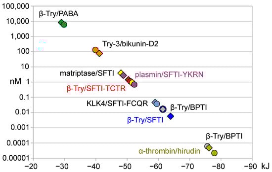 Plot of Ki values (nM) in logarithmic scale versus ΔG (kJ) for serine protease inhibitor complexes. The round symbols represent experimental Ki and ΔG values from protease–inhibitor pairs, while the diamonds belong to calculated Ki (KD) and ΔG derived from protease inhibitor complex coordinates: β-Try/PABA, Try-3/bikunin-D2, matriptase-SFTI, plasmin-SFTI, β-Try/SFTI-TCTR-N12-N14, KLK4/SFTI-FCQR-N14, β-Try/BPTI, and α-thrombin/hirudin (more β-Try structures with SFTI-1 variants are available). Essentially, free interaction energies were calculated with the YASARA plugin FoldX or with the web server PRODIGY. Overall, the FoldX results for serine protease inhibitor complexes correlated better with the experimental data. More details can be found in Table 1.