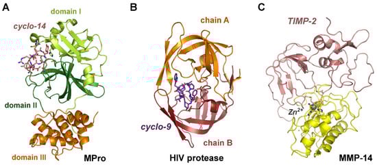 Examples of cysteine, aspartic and metalloproteases. (A) SARS-CoV-2 MPro is a chymotrypsin-like protease with a catalytic dyad (His41, Cys145) in the half domains I and II, while domain III mediates dimerization (PDB 7RNW). The synthetic, cyclo-14-mer inhibits with a Ki of roughly 4 nM. (B) Aspartic HIV protease forms a symmetrical active dimer, which binds a synthetic cyclo9-mer exhibiting an estimated Ki of 3 nM (PDB 7YF6). (C) The catalytic domain of MMP-14 (MT1-MMP) binds the natural proteinaceous inhibitor TIMP-2 via a tight interaction to Zn2+ from the N-terminal Cys1 and Thr2 in the S1′ pocket (PDB 1BUV), exhibiting a Ki of 104 pM.