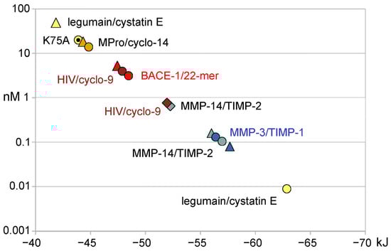 Plot of Ki values (nM) in logarithmic scale versus ΔG (kJ) for cysteine, aspartic and metallo-protease inhibitor complexes. The round symbols represent experimental Ki and ΔG values from protease–inhibitor pairs, while the diamonds and triangles belong to calculated Ki (KD) and ΔG derived from calculations with the YASARA plugin FoldX and the PRODIGY web server, respectively. The protease inhibitor complexes were legumain/cystatin E, SARS-CoV-2 Mpro/cyclo-14-mer, BACE-1/22-mer, HIV protease/cyclo-9-mer, MMP-14/TIMP-2, and MMP-3/TIMP-1. In five cases the correlation of experimental data was better with PRODIGY results. The cystatin E-K75A constant (19.8 nM) for human legumain corresponds better to the one derived from the coordinates of the structural data (46.4 kJ/mol) compared with the reported 0.011 nM. A better correlation was seen for energy minimized coordinates of the BACE-1 complex (−47.28 kJ/mol). More details can be found in Table 1.