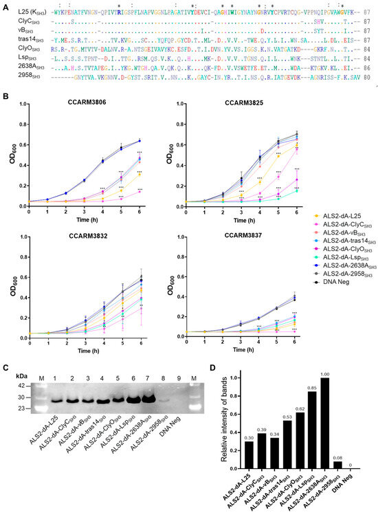 - Huang, L.; Luo, D.; Gondil, V.S.; Gong, Y.; Jia, M.; Yan, D.; He, J.; Hu, S.; Yang, H.; Wei, H. Construction and characterization of a chimeric lysin ClyV with improved bactericidal activity against Streptococcus agalactiae in vitro and in vivo. Appl. Microbiol. Biotechnol. 2020, 104, 1609–1619. [Google Scholar] [CrossRef] [PubMed]