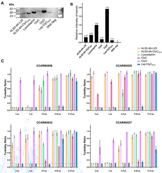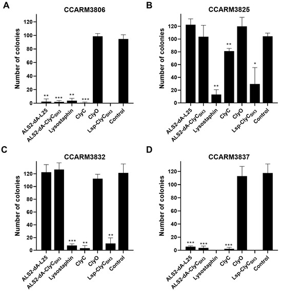 | Strains | ALS2-dA-L25 | ALS2-dA-ClyCSH3 | Lysostaphin | ClyC 1 | ClyO 2 | Lsp-ClyCSH3 |
