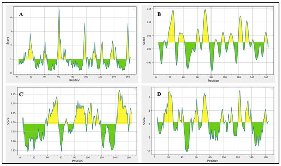 B-cell epitopes were identified using various IEDB epitope servers. Epitopes exhibiting positive interactions are highlighted in yellow. (A) The surface accessibility of B-cell epitopes was assessed using the Emini tool. (B) The flexibility of selected epitopes was evaluated using the Karplus & Schulz tool. (C) The antigenic potential of the final epitopes was observed using the Kolaskar & Tongaonkar method. (D) The hydrophilicity of epitopes was examined using the Parker method. The residues with scores higher than the threshold were predicted to be part of an epitope, as indicated in yellow.