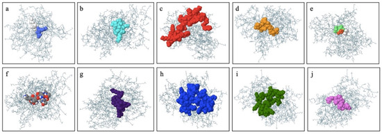 The final vaccine construct displays a three-dimensional representation of conformational or discontinuous epitopes (a–j) found within the highest antigenic polyprotein of gp120. The epitopes are depicted on the surface using various colors, while the bulk of the polyprotein is represented as sky blue sticks.