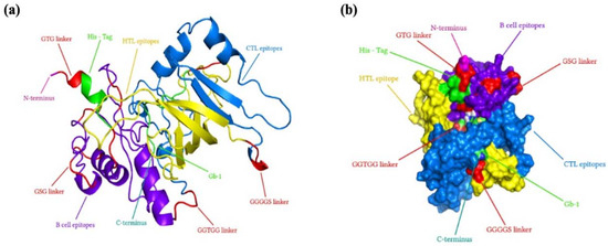The sequences, locations, and representations of the immunodominant B-cell, CTL, and HTL epitopes in the final vaccine construct, as well as the 3D view and locations of the immunodominant epitopes of the gp120 monomer, are shown. (a) The sequences and positions of the immunodominant epitopes are depicted in a cartoon shape. (b) The immunodominant epitopes are represented in a 3D view using the PyMOL 2.3.4 program. The surface representation shows the locations of the immunodominant epitopes on the closed conformation of the 3D gp120 protein of HIV-1.
