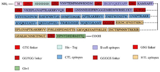 Representation of the HIV-1 gp120 construct schematic diagram, including B-cell, CTL, and HTL epitopes, linkers, and adjuvants. The Histidine-Tag is connected to the B-cell epitopes through a GTG linker. The B-cell epitopes are connected to the CTL epitopes using GGTGG linkers. The CTL epitopes, in turn, are connected to the HTL epitopes using GGGGS linkers. Finally, the HTL epitopes are connected to the adjuvant through a GTG linker.