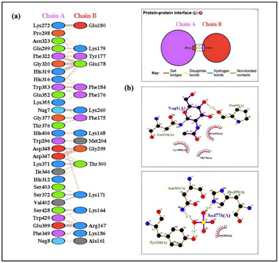 This figure illustrates the binding interaction between the active residues of a docked complex involving human TLR-2 and a vaccine construct. (a) In this complex, chain A represents the active residues of TLR-2, while chain B represents the active residues of the vaccine construct. (b) The docked conformation and interaction of TLR-2 and the vaccine construct are depicted via Ligplot analysis, highlighting the presence of hydrogen bonding and hydrophobic interactions between the construct.