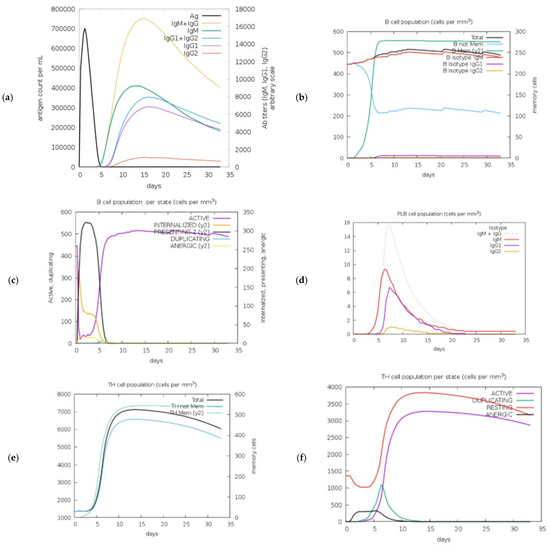 The immunological stimulation of the HIV-1 gp120 vaccine was evaluated using the C-ImmSimm tool, which also forecasted the abilities of epitopes to induce adaptive immunity. The immunological interactions between the epitopes and their particular targets were also established through this investigation. Results from the C-ImmSim online server showed that secondary immune response generation increased and followed the real immunological response. According to the results of the immunological simulation study, the HIV-1 gp120 vaccine can produce an immune response that is characteristic of the body’s immune system. With gradual doses, the vaccine was assessed to produce strong primary immunological responses (Figure 16a). Moreover, the primary immune feedback gradually improved with each dosage, and the secondary immune feedback was elevated. Furthermore, there were progressive increases in the numbers of plasma B cells, HTLs, and CTLs, indicating the development of an immune response with high potency, immunological memory, and efficient antigen removal from the host (Figure 16b–h). While the increase in dendritic cells and macrophages exhibited greater antigen presentation by APCs, the activation of helper T cells demonstrated the vaccine’s superior adaptive immunity (Figure 16i–l). IFN-γ, interleukin-23 (IL-23), IL-10, and IFN-γ have all been shown to be capable of being produced by the vaccine, which is vital for triggering immune feedback and protecting the body against viruses (Figure 16m,n). APCs, cytokines, active B cells, and T cells were among the promising characteristics of the vaccine that the immune simulation studies indicated were produced in substantial quantities. This shows that after being administered to the host, the polyvalent HIV-1 gp120 vaccine produced good immunogenic reactions. These findings show that following each injection, substantial immunological memory development, enhanced antigen clearance, and significant secondary immune responses occur.