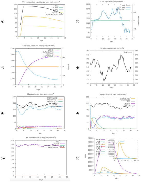 C−ImmSimm represents the immune stimulation of the best-predicted HIV-1 gp120 vaccine. (a) The immunoglobulin and immunocomplex responses to the HIV-1 gp120 vaccine inoculations are indicated by colored lines. (b–h) The number of plasma B cells, HTLs, and CTLs exhibited progressive increases, indicating the robust development of an immune response characterized by high potency, immunological memory, and efficient removal of antigens from the host. (i–l) The increase in DCs and macrophages exhibited greater antigen presentation by APCs, and the activation of helper T cells demonstrated the superior adaptive immunity of the vaccine. (m,n) The vaccine was shown to be capable of inducing the production of IFN-γ, IL-23, IL-10, IL-8 and IL-6, which are vital for triggering immune feedback and protecting the body against viruses.