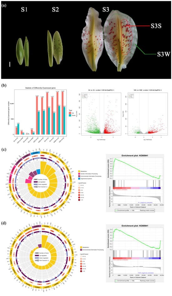 Developmental stages of L. auratum. and identification and KEGG/GSEA enrichment analysis of DEGs. (a) In S1, the interior tepals were 5.5 cm long, and uncoloured papillae could be observed. In S2, the interior tepals were 7.5 cm long, and the papillae turned purple. In S3, the interior tepals were 13 cm long, and the papillae turned red-orange. The outer white area of the tepal was sampled and named S3 W (marked with a green line). The red-orange papillae were detached and sampled and named S3S (marked with a red line). For details on the sampling, see Materials and Methods. The scale bar (white line) represents 1 cm. (b) DEGs were identified with a threshold p value < 0.05 and |log2FoldChange| (FC) > 1. (c) KEGG enrichment analysis (left) and GSEA enrichment analysis (right) of DEGs between S2 and S1. The top 20 enriched KEGG pathways were used for the KEGG enrichment circle diagram (from the outside to the inside, the first circle represents the ko-id of the pathway; the second circle represents the number and p value of background genes in this pathway, and the more genes there are, the longer the bar is; the third circle represents the number of DEGs in this pathway, with upregulated genes annotated purple and downregulated genes annotated blue; and the fourth circle represents the value of the Rich factor in this pathway). (d) KEGG enrichment analysis (left) and GSEA enrichment analysis (right) of DEGs between S3S and S3 W.