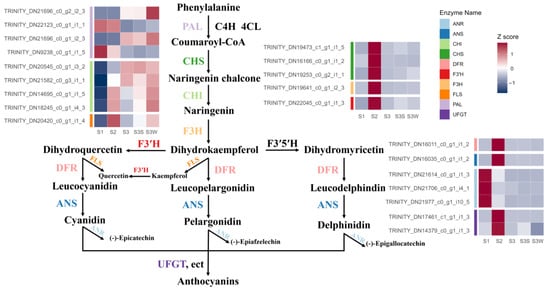 According to the NR, Swiss-Prot, and KEGG database annotations and alignments of the L. auratum transcriptome using orthologous genes from Arabidopsis, we identified 21 candidate transcripts that encode 10 key enzymes involved in anthocyanin biosynthesis (Table S2 and Figure 2). These transcripts are differentially expressed. The normalised expression abundance is shown on the heatmap in Figure 2. The relatedness of the gene expression was shown using a k-means clustering heatmap (Figure S1a). The transcript levels of CHS, F3H, F3′H, FLS, DFR, ANS, and UFGT were significantly upregulated between S2 and S1. These genes are known to contribute to anthocyanin accumulation [7]; the upregulation was consistent with the phenotypic change in S2 when papillae colouration began (Figure 1a). ANR was highly expressed in S1 but had low expression in S2 and thereafter, which is consistent with the knowledge that ANR has a negative effect on anthocyanin accumulation [7].