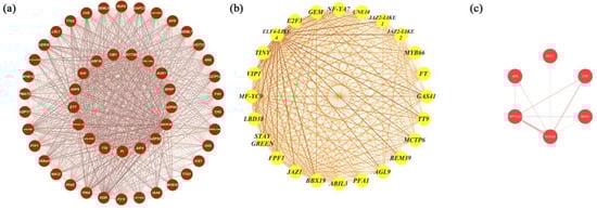 Coexpression network visualisation of hub genes from MEbrown, MEyellow, and MEred. (a) The coexpression network of the hub genes identified from the MEbrown cohort. The coexpression network consisted of 51 hub genes identified in MEbrown, ranked by degree, from TT8 (inner circle) to KDR (outer circle) clockwise. (b) The coexpression network of the hub genes from MEyellow. The coexpression network consisted of 24 hub genes identified in MEyellow, ranked by their degree value, starting from BBX19 clockwise. (c) The coexpression network of the hub genes from the MEred cohort. The coexpression network consisted of six hub genes identified in MEred, ranked by their degree value, starting from NCED4 clockwise. The thicker the edge and the darker the colour, the greater the weight, indicating a stronger coexpression relationship.