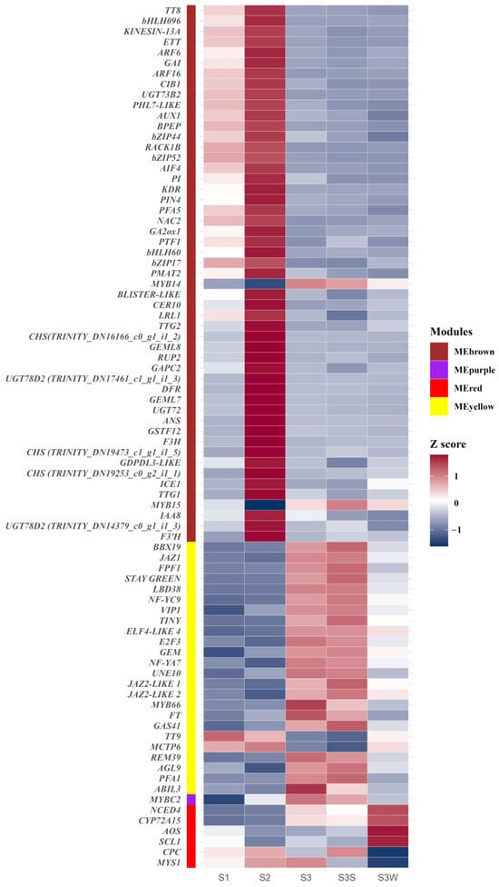 Gene expression profiles of hub genes in MEbrown, MEpurple, MEred, and MEyellow. The colour labels show the module to which the gene belongs. Gene expression was normalised to the Z score and represented using a heatmap.