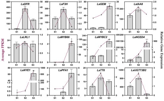 qRT-PCR analyses were performed to verify the gene expression patterns obtained via RNA-seq, and the interior tepals of L. auratum at three developmental stages (S1–S3) were used as samples for RNA extraction and cDNA synthesis. β-actin was used as the internal control. We randomly selected twelve genes from our identified hub genes for qRT-PCR validation. Overall, most of the gene expression patterns measured using qRT-PCR were consistent with those obtained in the RNA-seq analysis (Figure 6), indicating the reliability and accuracy of our RNA-seq analysis. To further explore whether these hub genes may be involved in imparting papillae formation in other lilies, we identified these twelve hub genes in the L. speciosum var. gloriosoides transcriptome from lily flowers that were sampled at similar development stages (i.e., S1, S2, and S3), and we presented the gene expression levels (FPKM) as histograms (Figure S5). Most of these hub genes showed similar expression trends in L. auratum and L. speciosum var. gloriosoides.