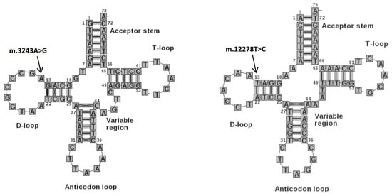 The well-known variant described above was accompanied by two more extremely rare variants identified in the tRNA genes for leucine (MT-TL2) and arginine (MT-TR). Particularly noteworthy is the m.12278T>C variant which is present in the MT-TL2 gene; this variant has also been recorded in a heteroplasmic form (9%) in a Polish patient with type two diabetes mellitus []. This variant is also included in the ClinVar database, and like the m.3243A>G variant it is associated with the MELAS (mitochondrial encephalomyopathy, lactic acidosis and stroke-like episodes) phenotype. The m.3243A>G variant for diabetes also occurs in the tRNA gene for leucine; it is well documented to have damaging effects. Additionally, Figure 1 clearly shows that both variants m.3243A>G and m.12278T>C cause changes at the beginning of the D-loop and may disturb its structure; these alterations can be critical and result in impaired glucose metabolism. Unfortunately, it was not possible to confirm the genotype–phenotype relation in the studied family. Nevertheless, summarizing all the available data, variant m.12278T>C can be considered as pathogenic based on the ACMG classification.