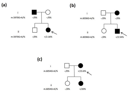 Genetic history of the family with the heteroplasmic variant in the MT-COI gene. (a) 5970G>A variant, (b) 6036G>A variant, (c) 6054G>A variant. Genotype is shown underneath each symbol; − and + indicate wild-type and mutant allele, respectively, together with the proportion of heteroplasmic variants in %. The squares represent male family members, and the circles female members. Black-filled symbols denote patients with diabetes; an arrow denotes the proband in the family.