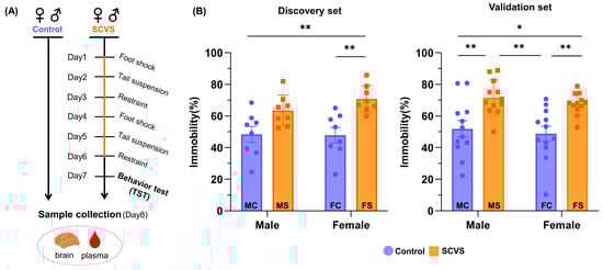 Scheme for the establishment of SCVS model in the discovery and validation sets (A) and tail suspension test results (B). * and ** indicate significant differences with p < 0.05 and p < 0.01, respectively. Results in (B) are displayed as mean ± S.E.M. Number of mice per group: n = 8 in the discovery set and n = 12 in the validation set.