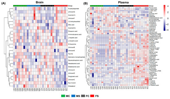 Hierarchical clustering analysis and heat map of the selected differential metabolites in brain (A) and plasma (B). Group identification: FC, female without SCVS; FS, female with SCVS; MC, male without SCVS; MS, male with SCVS.