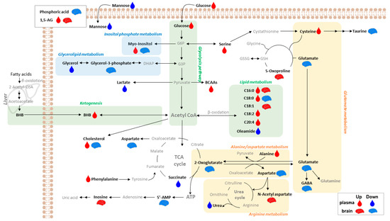 After the SCVS treatment, the female presented 23 stress-specific brain metabolites (FS vs. FC, Table S2). In plasma, the female showed 41 stress-specific metabolites, which include 22 stress-differential metabolites among the female mice (FS vs. FC) and 39 sex-differential metabolites among the stressed mice (FS vs. MS) (Table 2). Many of these sex-differential metabolites overlap with the stress-differential metabolites with significant fold changes in the same direction, including L-lactic acid, L-alanine, β-hydroxybutyric acid (BHB), urea, L-serine, phenylalanine, glycerol, D-glucose, and oleamide. All the differential brain and plasma metabolites were further applied to the hierarchical clustering analysis (HCA), of which the results are illustrated in Figure 2. Many of the differential brain metabolites showed downregulation in the FS mice (Figure 2A). The plasma of the FS mice presented unique signatures, which were characterized primarily by upregulation compared with those of the other groups of mice (Figure 2B). All the identified differential metabolites were used for the pathway analysis to examine the perturbed metabolic pathways in the SCVS-treated female mice. The most significantly affected pathways with impact values >0.1 and –log10(p) >2.0 include alanine, aspartate, and glutamate metabolism and arginine biosynthesis in the brain. A schematic of the affected pathways based on biochemical relationships is presented in Figure 3.