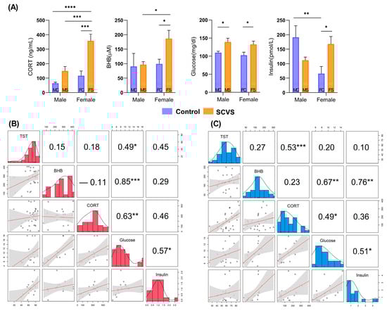 (A) Plasma concentrations of key biomolecules in the discovery set of SCVS model. Data are shown as mean ± S.E.M (n = 8 per group). (B) Correlation analysis among female mice. (C) Correlation analysis among male mice. Numbers and red lines in box (B and C) indicate the correlation coefficients and regression lines, respectively. *, **, ***, and **** indicate p < 0.05, p < 0.01, p < 0.001, and p < 0.0001, respectively. Abbreviations: CORT, corticosterone; BHB, 3-hydroxybutyric acid.
