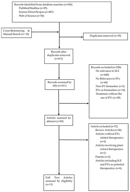 The database searches identified a total of 636 publications, including articles that were manually searched, which are recorded in Figure 2. A total of 35 duplicates were removed, and a total of 611 articles were screened based on the titles. In total, 528 records were excluded, with 440 articles excluded due to their irrelevance to SLE. A total of 14 papers were excluded as EVs were identified as biomarkers instead of therapeutics. A total of 44 papers were excluded due to irrelevance to EVs. Two articles were excluded as the paper mentioned non-EV biomarkers. Moreover, 28 articles were excluded as the treatment method did not involve EV vesicles. Eighty-three articles were then screened based on the abstracts, and a total of seventy-two articles were excluded, with thirty-four articles being review articles, two articles without the use of EVs, and one article based on plant-derived EVs. Two searches were excluded as they were patents, and a total of six had mentioned the future potential of EVs as therapeutics for SLE. A total of 11 full-text articles were assessed for their eligibility, and all 11 articles were included in this review (Figure 2). A total of nine studies mentioned exosomes as the type of EVs used, while one study mentioned apoptotic vesicles, and another study mentioned EVs.