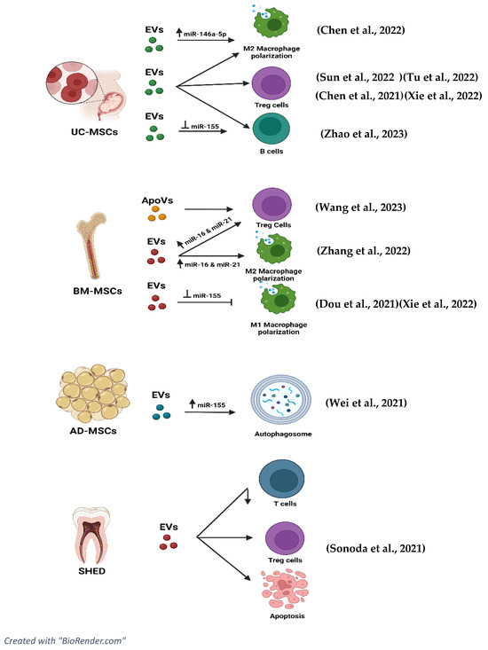 EVs and miRNAs that are related in ameliorating the disease progression of SLE. BMMSCS, bone marrow mesenchymal stromal cells; SHED, stem cells from human exfoliated deciduous teeth; hucMSCs, human umbilical cord mesenchymal stromal cells; AD-MSCS, adipose-derived mesenchymal stromal cells; UC-MSCs, umbilical cord mesenchymal stromal cells [1,43,44,45,46,47,48,49,50,51,52].
