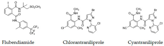- Seo, A.; Tohnishi, M.; Nakao, H.; Furuya, T.; Kodama, H.; Tsubata, K.; Fujioka, S.; Kodama, H.; Nishimatsu, T.; Hirooka, T. Flubendiamide, a new insecticide characterized by its novel chemistry and biology. In Pesticide Chemistry: Crop Protection, Public Health, Environmental Safety; Ohkawa, H., Miyagawa, H., Lee, P.W., Eds.; Wiley-VCH Verlag: Weinheim, Germany, 2007; pp. 127–135. [Google Scholar]