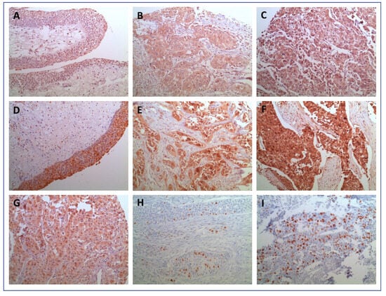 (A–I) Representative staining for immunohistochemistry of IL-1β/IL-1RA, AKT, and Ki-67 signaling pathway markers in bladder cancer and normal tissues. (A–C) Cytoplasmic IL-1β immunostaining in bladder tissue: (A)—staining in benign tissue; (B,C)—low and high staining in cancer tissue. (D–F) Cytoplasmic IL-1RA immunostaining in bladder tissue: (D)—staining in benign tissue; (E,F)—low and high staining in cancer tissue. (G) Cytoplasmic and partial nuclear staining of AKT in cancer tissue. (H,I) Low and strong (≥15%) nuclear staining of Ki-67 in cancer tissue. Magnification: 200-fold.