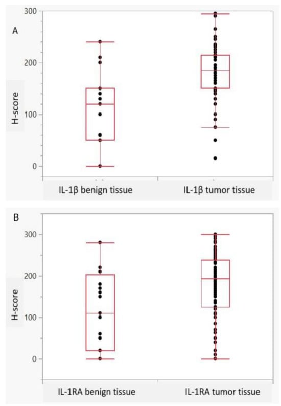 A–B. Expression patterns of IL-1β and IL-1RA. (A), Intensity of IL-1β cells expression and in (B), Intensity of IL-1RA cells expression in benign and malignant tissue; p = 0.0001 and p = 0.004, Wilcoxon Kruskal-Wallis tests).
