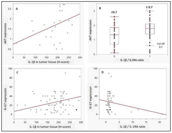 (A–D). (A), Correlation between expression patterns of IL-1β and AKT in tumor tissue (p = 0.04, r2 corrected 0.14); (B), Positive correlation between AKT expression pattern and IL-1 ratio, for the determined cut-off value (0—under 0.7 cut-off; 1—over or = 0.7 cut-off); (C,D), Positive correlation between IL-1β expression and Ki-67 expression in tumor tissue (p = 0.011, r2 = 0.095), as well as positive correlation trend of Ki-67 high expression towards IL-1 beta/IL-1RA ratio (p = 0.08).